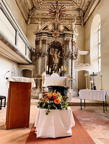 Nach der Auferstehung Jesu am Ostsonntag erschien er 40 Tage lang immer wieder den Jüngern, um sich als lebendig zu erweisen und um vom Himmelreich zu reden (Apostelgeschichte 1, 1-11, heutige Epistel). Dann ist er vor ihren Augen in den Himmel aufgefahren, wie auf dem Altar in St. Martin dargestellt: Christi Himmelfahrt … oder: Als Jesus begann, wieder von Zuhause aus zu arbeiten. In der Himmelfahrtkapelle auf dem Ölberg in Jerusalem ist der letzte Fußabdruck Jesu auf Erden im Stein zu sehen. Dieser Abdruck ist Sinnbild für den Eindruck, den er unauslöschlich in die Herzen der Apostel und in den Glauben der Kirche geprägt hat. In seiner Himmelfahrt hat Jesus nicht nur sein Erlösungswerk vollendet, sondern auch die menschliche Natur zur göttlichen Herrlichkeit erhoben. Er ist das Haupt seines mystischen Leibes – nämlich der Kirche – und er hat sich zur Rechten des Vaters gesetzt. Jesus war vom Himmel gekommen und ist nun in den Himmel heimgekehrt, damit hat er uns den Himmel näher gebracht. Er ist vorausgegangen, um auch uns seiner Göttlichkeit teilhaftig zu machen. Im festen Glauben sollen wir tatsächlich dem Geiste nach im Himmel wohnen und mit ganzer Entschiedenheit suchen, was droben ist, wo Christus ist, sitzend zur Rechten Gottes (Kolosser 3, 1). Als Christus vor den Augen der Jünger entrückt wurde, sprachen die Engel von seiner Wiederkunft (Matthäus 24, 27 und 30). Und bis dahin gilt, den Missionsbefehl, den Jesus seiner Kirche wie ein Vermächtnis erteilt hat, treu auszuführen und IHN „bis ans Ende der Erde“ (Apostelgeschichte 1, 8) vor aller Welt zu bezeugen. Schon bei Christi Himmelfahrt war ihm bewusst, dass der Auftrag dieser Zeugenschaft die menschliche Kraft übersteigt und Jesus gebot den Aposteln, die Herabkunft des Heiligen Geistes zu erwarten. Und mit guten Grund bereitet sich nun die Kirche – gemeinsam mit den Aposteln – auf Pfingsten, den Tag der Ausschüttung des Heiligen Geistes, vor. Ein Pfarrer schreibt im Religionsunterricht das Wort „Himmel” an die Tafel und sagt zu den Schülern: „Nennt mir bitte Sätze, in denen das Wort ,Himmel‘ vorkommt”. Die Schüler nennen folgende Sätze: „Der Himmel ist blau.”, „Am Himmel ziehen Wolken.”, „Vom Himmel regnet es.” Schließlich formuliert ein Schüler auch folgenden Satz: „Nach dem Tod kommen wir in den Himmel.” Und schon werden weitere Sätze in den Raum gerufen: „Gott ist im Himmel.” „Jesus ist im Himmel.” usw. Der Pfarrer fragt: „Ist euch aufgefallen, dass wir das eine Wort ,Himmel‘ gebrauchen und doch zwei ganz verschiedene ,Dinge‘ meinen?” Nach einigem Überlegen antwortet ein Schüler: „Einmal meinen wir den Himmel, den wir mit diesen Augen sehen können, das andere Mal meinen wir den Himmel, den wir nur mit den Augen des Glaubens sehen können.” – Die Antwort gefällt dem Pfarrer: „Ja, den einen Himmel können wir sehen und leicht beschreiben: Es ist der Himmel über uns. Er ist manchmal blau, manchmal auch grau und wolkenverhangen. In der Nacht sehen wir viele Sterne am dunklen Himmel funkeln. Aber wie ist es mit dem ,anderen Himmel‘? Wie können wir den beschreiben? Wie sieht der aus?”. Er schlägt den Schülern vor: „Erinnert euch bitte einmal, wie das war, als ihr euch einmal, wie im siebten Himmel‘ gefühlt habt! Wie ging es euch dabei und was war der Grund dafür?” – Die Antworten kommen schnell: „Da war ich glücklich!”, „Da habe ich eine große Freude erlebt!”, „Da hatte ich ein besonders schönes Erlebnis!”, „Da war ich mit guten Freunden zusammen – oder mit meinen Eltern.”. Das sind Beschreibungen dieses „anderen Himmels”! Wenn wir von diesem Himmel sprechen, dann meinen wir: Da bin ich glücklich, da bin ich froh, da weiß ich mich geliebt und angenommen. Himmel in diesem Sinn, das ist der Ort, wo ich ganz ich selbst sein darf, angenommen und geliebt. In diesem Himmel lebt Jesus: Das und nichts anderes feiern wir Christen heute am Fest Christi Himmelfahrt. Jesus, der auf dieser Erde gelebt hat, der den Menschen die Botschaft von der Liebe Gottes verkündet hat; Jesus, der Menschen mit seiner Liebe gesund und froh gemacht hat; dieser Jesus, der schließlich am Kreuz getötet wurde, dieser Jesus lebt jetzt ganz in der Liebe Gottes. Eigentlich war Jesus schon immer in diesem Himmel, weil er sich immer, auch auf dieser Erde, von Gott geliebt und angenommen wusste. Jetzt aber ist er es endgültig. Jetzt kann ihn nichts mehr trennen von der Liebe Gottes. Darum wird uns im heutigen Evangelium (Lukas 24, 44-53) auch erzählt, dass die Jünger „in großer Freude” vom Ölberg in die Stadt zurückkehrten, nachdem Jesus zum Himmel emporgehoben wurde. Dass Jesus im Himmel ist, das ist kein Grund zur Trauer. Es ist ein Grund zur Freude. Denn wenn Jesus in diesem Himmel lebt, wenn er also Gott ganz nahe ist, dann ist er uns Menschen nicht fern. Dann ist er auf eine neue Weise nahe, auf eine Weise, die wieder nicht mit diesen Augen, aber mit den Augen des Herzens, mit den Augen des Glaubens zu erkennen ist. „Brannte uns nicht das Herz, als er uns unterwegs die Schrift erklärte?” So sagten die beiden Jünger, die nach Emmaus unterwegs waren. – Brannte uns nicht das Herz bei diesem oder jenem Gottesdienst, bei dieser Begegnung oder jenem Gespräch, bei dem oder jenem Ereignis in unserem Leben? – „Ich bin bei euch alle Tage bis an der Welt Ende.” (Matthäus 28, 20). Auch dieses Wort Jesu gehört zum Fest Christi Himmelfahrt. Jesus ist beim Vater, er ist Gott ganz nahe, er lebt ganz in seiner Liebe. Das ist die eine Seite dessen, was es bedeutet, dass er „im Himmel” ist. Die andere Seite davon bedeutet: Jesus ist auch uns nahe: in unserem Herzen, in unserer Gemeinschaft, beim Beten, beim Gottesdienst, in Gesprächen, wo zwei oder drei in seinem Namen versammelt sind, und selbst dann, wenn wir es nicht ahnen. Ich bin bei euch alle Tage bis zur Vollendung der Welt. So beginnt Kirche: Die Jünger